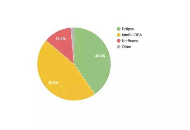 對應的是sublime、atom……從這個角度講,VSCode無疑是最成功的,正在蠶食競爭對手的市場。而JetBrains系列對應的是 Visual Studio。如果按語言區(qū)分,Java(Android) 陣營的 IDE 正在被 JetBrains 蠶食。從去年(2016)IntelliJ IDEA 就超越了 Eclipse,下圖是今年的份額: