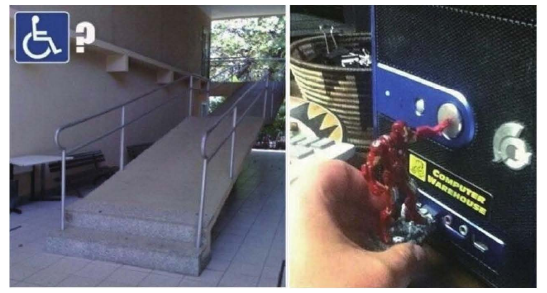 圖1-6是2幅網(wǎng)絡(luò)上流傳的照片,左圖的通道是為了殘障人士而設(shè)計(jì)的嗎? 看樣子好像是,又好像不是,讓人匪夷所思。右圖是鋼鐵俠造型的U盤,外觀很酷是不是? 但是使用的時(shí)候好像出了點(diǎn)問(wèn)題。鋼鐵俠的手緊緊地按住了關(guān)機(jī)鍵,且手臂不能自由活動(dòng) 。