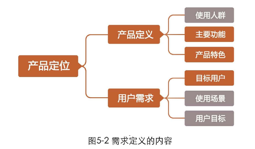 產(chǎn)品定位實際上就是關(guān)于產(chǎn)品的目標(biāo)、范圍、特征等約束條件,它包括兩方面的內(nèi)容:產(chǎn)品定義和用戶需求。產(chǎn)品定義主要由產(chǎn)品經(jīng)理從網(wǎng)站角度考慮,用戶需求主要由設(shè)計師從用戶角度考慮。最終的產(chǎn)品定位應(yīng)該是綜合考慮兩者關(guān)系的結(jié)果。需求定義的內(nèi)容如圖5-2所示。