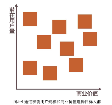 該選擇哪種類型作為產(chǎn)品的目標(biāo)用戶,需要綜合權(quán)衡用戶對公司的價值以及潛在需求量。別忘了,平衡商業(yè)價值和用戶需求本來就是設(shè)計師需要特別關(guān)注到的。在一個坐標(biāo)平面上對潛在用戶進(jìn)行分布羅列,坐標(biāo)平面的2個坐標(biāo)軸分別是潛在用戶量和商業(yè)價值 (包含對推廣、營銷成本的考慮),如圖5-4所示。我們優(yōu)先考慮最右上角那些潛在用戶量大和商業(yè)價值大 (推廣成本低) 的用戶。因為要同時考慮到產(chǎn)品利益和用戶需求,所以這項工作最好由產(chǎn)品經(jīng)理和設(shè)計師配合完成。