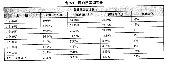 據(jù)著名市場(chǎng)調(diào)研公司 Hitwise 2009年2 月的研究,用戶實(shí)際使用的搜索詞有越來(lái)越長(zhǎng)的趨勢(shì),如表 3-1 所示是 2008 年 1 月到2009 年 1 月用戶搜索關(guān)鍵詞長(zhǎng)度變化趨勢(shì) 。