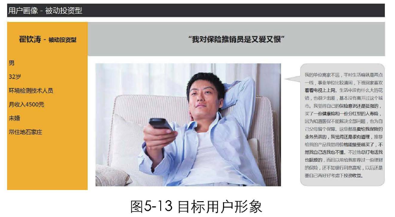 有的產(chǎn)品經(jīng)理和設(shè)計(jì)師還會把目標(biāo)用戶的特征抽象成具體的人物、制作成卡片,貼在自自己的辦公桌上,時刻提醒自己,這才是我的目標(biāo)用戶,我做需求、設(shè)計(jì)決策時要圍繞他來考慮。他的使用場景、使用目標(biāo)是什么?我們希望他如何使用我們的產(chǎn)品,以實(shí)現(xiàn)我們的商業(yè)價值?如圖5-13所示,這是一個虛擬的目標(biāo)用戶形象。