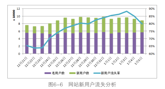 例如,網(wǎng)站的推廣部門有個(gè)需求:網(wǎng)站在年底的圣誕和元旦雙節(jié)日(12月24日到1月3日,為期11天)針對(duì)新用戶做了一個(gè)促銷推廣活動(dòng),活動(dòng)期限內(nèi)新注冊用戶可以免費(fèi)領(lǐng)取20元的現(xiàn)金抵價(jià)券,在3天有效期內(nèi)購買任意商品時(shí)都可以使用,需要分析這次活動(dòng)為網(wǎng)站用戶數(shù)的增長所帶來的效果。從活動(dòng)的內(nèi)容來看,活動(dòng)的主旨是帶動(dòng)網(wǎng)站新用戶的注冊和消費(fèi),為網(wǎng)站積累用戶數(shù),既然針對(duì)新用戶,可以對(duì)流失用戶做進(jìn)一步細(xì)分,分析活動(dòng)期間新用戶的流失情況,如圖6-6所示。