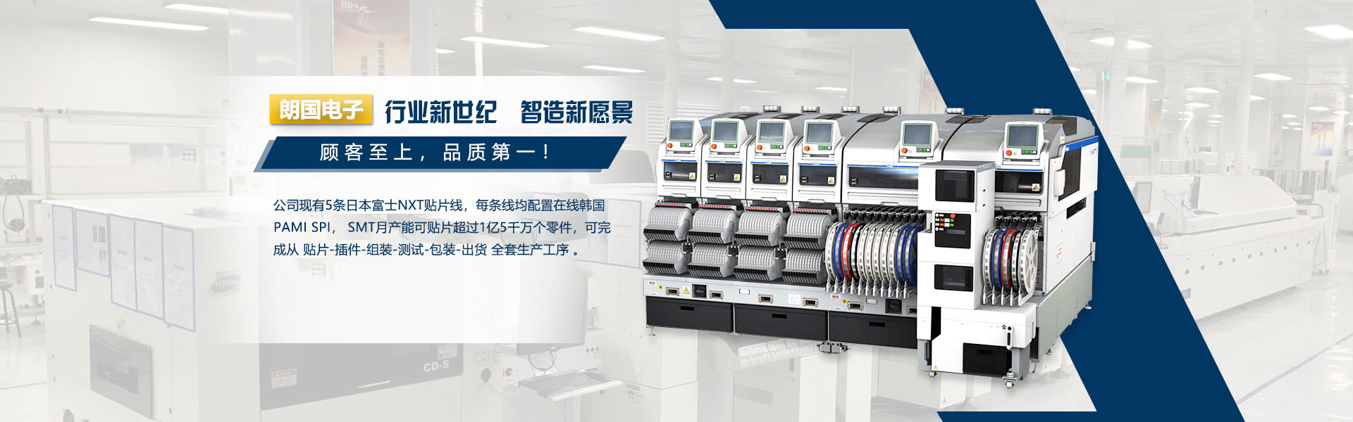 公司現(xiàn)有5條日本富士NXT貼片線,每條線均配置在線韓國(guó)PAMI SPI, SMT月產(chǎn)能可貼片超過(guò)1億5千萬(wàn)個(gè)零件,可完成從 貼片-插件-組裝-測(cè)試-包裝-出貨 全套生產(chǎn)工序 。