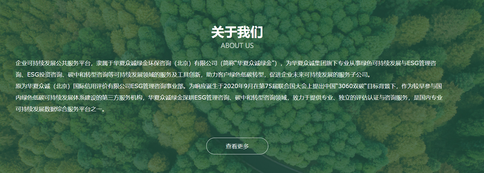 原為華夏眾誠(chéng)(北京)國(guó)際信用評(píng)價(jià)有限公司ESG管理咨詢事業(yè)部。為響應(yīng)誕生于2020年9月在第75屆聯(lián)合國(guó)大會(huì)上提出中國(guó)“3060雙碳“目標(biāo)背景下,作為較早參與國(guó)內(nèi)綠色低碳可持續(xù)發(fā)展體系建設(shè)的第三方服務(wù)機(jī)構(gòu),華夏眾誠(chéng)綠金深耕ESG管理咨詢、碳中和轉(zhuǎn)型咨詢領(lǐng)域,致力于提供專業(yè)、獨(dú)立的評(píng)估認(rèn)證與咨詢服務(wù),是國(guó)內(nèi)專業(yè)可持續(xù)發(fā)展數(shù)據(jù)綜合服務(wù)平臺(tái)之一。