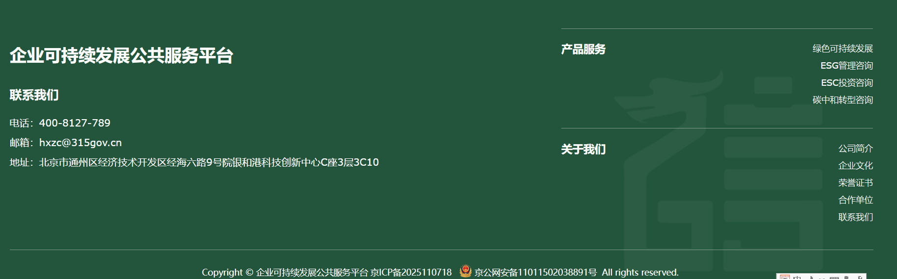 企業(yè)可持續(xù)發(fā)展公共服務(wù)平臺(tái),隸屬于華夏眾誠(chéng)綠金環(huán)保咨詢(北京)有限公司(簡(jiǎn)稱“華夏眾誠(chéng)綠金”),為華夏眾誠(chéng)集團(tuán)旗下專業(yè)從事綠色可持續(xù)發(fā)展與ESG管理咨詢、ESG投資咨詢、碳中和轉(zhuǎn)型咨詢等可持續(xù)發(fā)展領(lǐng)域的服務(wù)及工具創(chuàng)新,助力客戶綠色低碳轉(zhuǎn)型,促進(jìn)企業(yè)未來(lái)可持續(xù)發(fā)展的服務(wù)子公司。