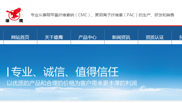 安丘市*鷹纖維素有限責(zé)任公司是由原安丘市纖維素廠組建而成,始建于一九八五年,是專業(yè)從事羧甲基纖維素鈉(CMC)、聚陰離子纖維素(PAC)的生產(chǎn)、研發(fā)和銷售的高新技術(shù)企業(yè);公司坐落于山東濰坊,現(xiàn)占地面積9萬多平方米, 年產(chǎn)羧甲基纖維素鈉25000噸和聚陰離子纖維素5000噸。公司主導(dǎo)產(chǎn)品“雄鷹”牌羧甲基纖維素鈉廣泛應(yīng)用于食品、洗滌、石油、卷煙、造紙、陶瓷、印染、紡織、醫(yī)藥、焊接等工業(yè)。公司通過了 ISO9001質(zhì)量管理體系認(rèn)證、HACCP 食品安全管理體系認(rèn)證,伊斯蘭HALAL 和 猶太KOSHER認(rèn)證。自一九九五年以來,公司先后被安丘市委、市府評(píng)為"最佳經(jīng)濟(jì)效益企業(yè)",被中國(guó)農(nóng)業(yè)銀行濰坊市分行評(píng)為"AAA級(jí)信用企業(yè)",被國(guó)家農(nóng)業(yè)部評(píng)為"全國(guó)質(zhì)量管理達(dá)標(biāo)企業(yè)"。一九九五年HPMC纖維素獲山東科技進(jìn)步二等獎(jiǎng)。二00六年十月,"雄鷹"被山東省宣傳部評(píng)為山東省民營(yíng)企業(yè)知名品牌。二00七年,"雄鷹"商標(biāo),被評(píng)為山東省著名商標(biāo)。公司主要市場(chǎng)分布于浙江、安徽、上海、四川、江蘇、山西、山東等省市,并出口東南亞,中東,非洲,歐洲,美洲,日韓等國(guó)家(地區(qū))。