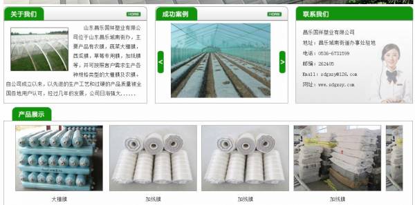 山東昌樂國*塑業(yè)有限公司位于山東昌樂城南街辦,主要產(chǎn)品有農(nóng)膜,蔬菜大棚膜,西瓜膜,草莓專用膜,加線膜等,并可按照客戶需求生產(chǎn)各種規(guī)格類型的大棚膜及農(nóng)膜。 自公司成立以來,以先進的生產(chǎn)工藝和過硬的產(chǎn)品質(zhì)量被全國各地用戶認可,經(jīng)過幾年的發(fā)展,公司日漸強大,同時我們也在不斷的研究和探索,今年我們公司又成功研究出一種高科技產(chǎn)品——強力高光太陽能增產(chǎn)膜,經(jīng)過在東北三省、福建、河北等低溫天氣地區(qū)試點大獲成功。使用高光太陽能膜的特點是:終生無霧,超長的流滴期能達到1-2年,使作物明顯增產(chǎn)、色澤鮮艷、減少病蟲害、棚內(nèi)溫度比普通膜能提高2-3度,現(xiàn)在我公司生產(chǎn)的農(nóng)膜銷往全國各地,目前公司可生產(chǎn)1-16米任何產(chǎn)品。本公司在全國各地誠招代理商與我們共創(chuàng)輝煌業(yè)績。