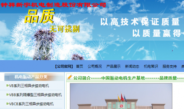 鐘祥新宇機(jī)電制造股份有限公司前身是鐘祥電機(jī)廠,創(chuàng)建于1968年,于2014年9月24日由“鐘祥新宇機(jī)電制造有限公司”變更名為“鐘祥新宇機(jī)電制造股份有限公司”。主要生產(chǎn)各類振動(dòng)電機(jī)、振動(dòng)機(jī)械、輸送機(jī)械。是中國(guó)電器工業(yè)協(xié)會(huì)中小型電機(jī)分會(huì)理事單位、中國(guó)重型機(jī)械工業(yè)協(xié)會(huì)洗選設(shè)備專業(yè)委員會(huì)理事單位,是中國(guó)具備真實(shí)生產(chǎn)實(shí)力的振動(dòng)電機(jī)生產(chǎn)廠家。科研開(kāi)發(fā)力量雄厚,公司技術(shù)中心認(rèn)定為“湖北省企業(yè)技術(shù)中心”,現(xiàn)有教授級(jí)高級(jí)工程師2人,享受?chē)?guó)家政府津貼專家2人,是國(guó)家部頒(行業(yè))標(biāo)準(zhǔn)《振動(dòng)源三相異步振動(dòng)電機(jī)技術(shù)條件》的主要制訂單位。企業(yè)內(nèi)部局域網(wǎng)、公司網(wǎng)站、CAD設(shè)計(jì)系統(tǒng)、互聯(lián)網(wǎng)已構(gòu)筑起企業(yè)計(jì)算機(jī)信息管理系統(tǒng);企業(yè)質(zhì)量管理體系獲得ISO9001:2000質(zhì)量管理體系認(rèn)證證書(shū);產(chǎn)品獲CQC認(rèn)證和CCC認(rèn)證;享有“外貿(mào)進(jìn)出口自營(yíng)權(quán)”。是國(guó)內(nèi)很早生產(chǎn)振動(dòng)電機(jī)的廠家之一,生產(chǎn)的“宇興”牌振動(dòng)電機(jī)是國(guó)內(nèi)振動(dòng)電機(jī)行業(yè)和廣大客戶公認(rèn)的品牌產(chǎn)品。