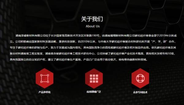 湖南澤睿新材料有限公司位于長沙國家級高新技術開發(fā)區(qū)環(huán)聯(lián)路190號,由湖南博翔新材料有限公司碳化硅纖維事業(yè)部于2019年分拆成立。公司積極響應國家新材料發(fā)展戰(zhàn)略,秉承科技創(chuàng)新,自2010年以來,與中南大學碳化硅纖維復合材料研究所開展“產(chǎn)、學、研”合作,專注于碳化硅纖維的研制與生產(chǎn),致力于發(fā)展成為國內(nèi)領先、具有國際競爭力的高性能碳化硅纖維及相關制品供應商。依托碳化硅纖維及其復合材料湖南省工程實驗室、湖南省含鈹碳化硅纖維工程技術研究中心,公司突破了碳化硅纖維產(chǎn)業(yè)化技術瓶頸,擁有相關發(fā)明專利10項,具有我國獨立的自主知識產(chǎn)權,建立了碳化硅纖維生產(chǎn)基地,產(chǎn)品已廣泛應用于航空航天、核電等熱端新材料領域。